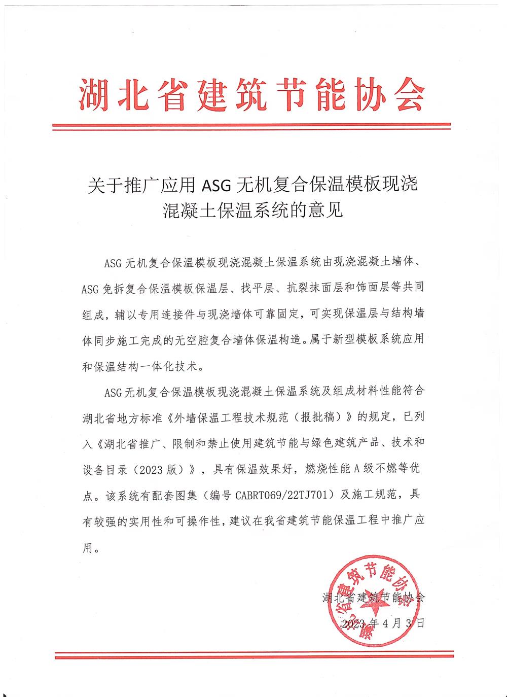 ASG無機復合保溫模板現(xiàn)澆混凝土保溫系統(tǒng)及組成材料性能符合湖北省地方標準《外墻保溫工程技術(shù)規(guī)范(報批稿)》的規(guī)定,已列入《湖北省推廣、限制和禁止使用建筑節(jié)能與綠色建筑產(chǎn)品、技術(shù)和設(shè)備目錄(2023版)》,具有保溫效果好,燃燒性能A級不燃等優(yōu)點。該系統(tǒng)有配套圖集(編號CABRT069/22TJ701)及施工規(guī)范,具有較強的實用性和可操作性,建議在我省建筑節(jié)能保溫工程中推廣應用。