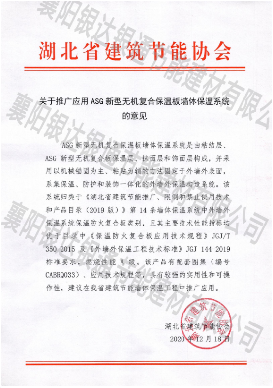 日前湖北省建筑節(jié)能協(xié)會發(fā)布關于推廣應用ASG新型無機復合保溫板墻體保溫系統(tǒng)的意見如下: