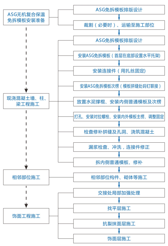 ASG無機(jī)復(fù)合保溫免拆模板可用作各類現(xiàn)澆鋼筋混凝土墻、梁、柱等部位的外模板使用,系統(tǒng)由現(xiàn)澆混凝土結(jié)構(gòu)層、ASG無機(jī)復(fù)合保溫免拆模板、找平層、抗裂抹面層和飾面層等共同組成,輔以連接件與基層現(xiàn)澆混凝土可靠固定,可實(shí)現(xiàn)保溫與結(jié)構(gòu)同步施工完成的無空腔復(fù)合墻體保溫構(gòu)造技術(shù)。